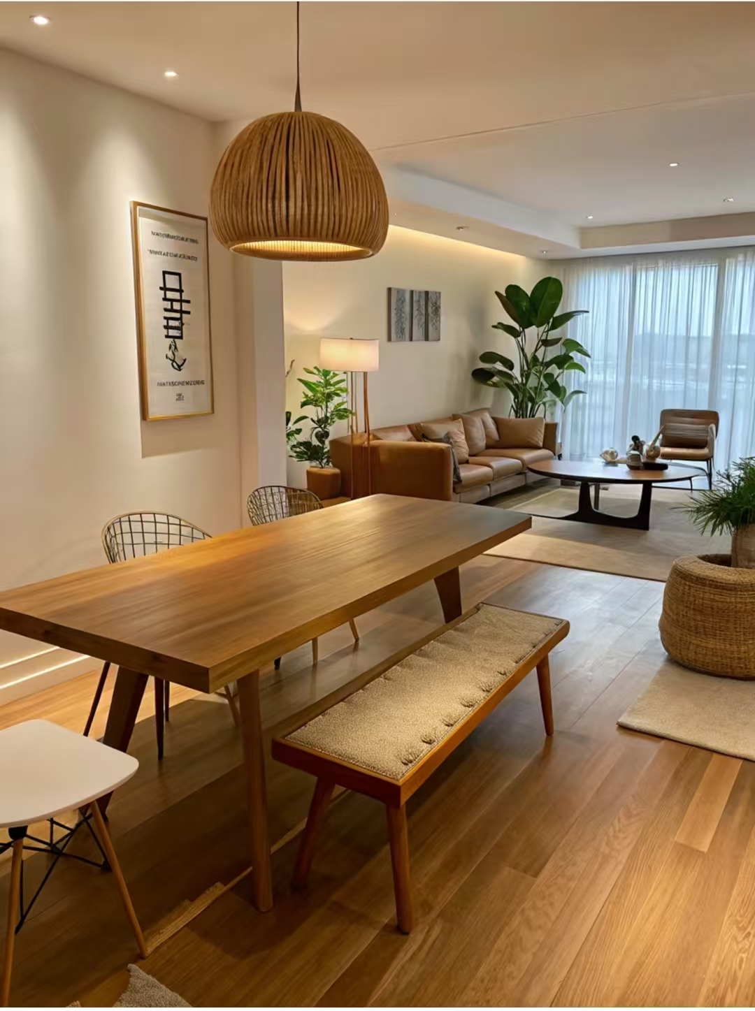Puidust söögilaud on lihtne ja elegantne, ümbritsetud erinevate stiilide toolidega, segades moodsa minimalismi vintage võluga.