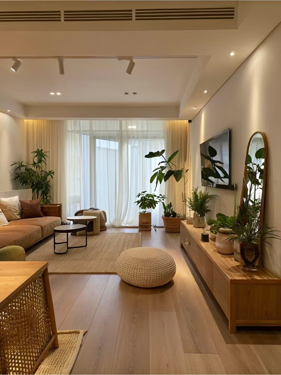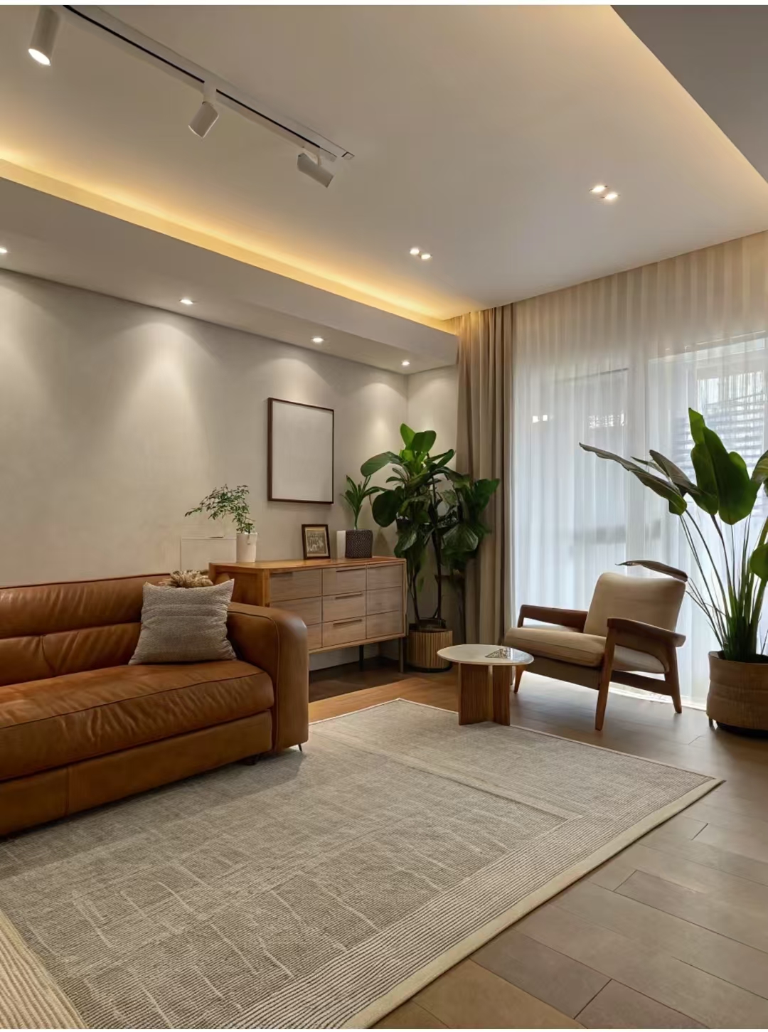 Kerged beeži seinad täiendavad sooja puitpõrandaid, väljutades loomuliku õhkkonna. Rikkaliku tekstuuriga pruun nahast diivan, mis on koos mitme pehmete padjadega, kutsub teid otse sisse vajuma.