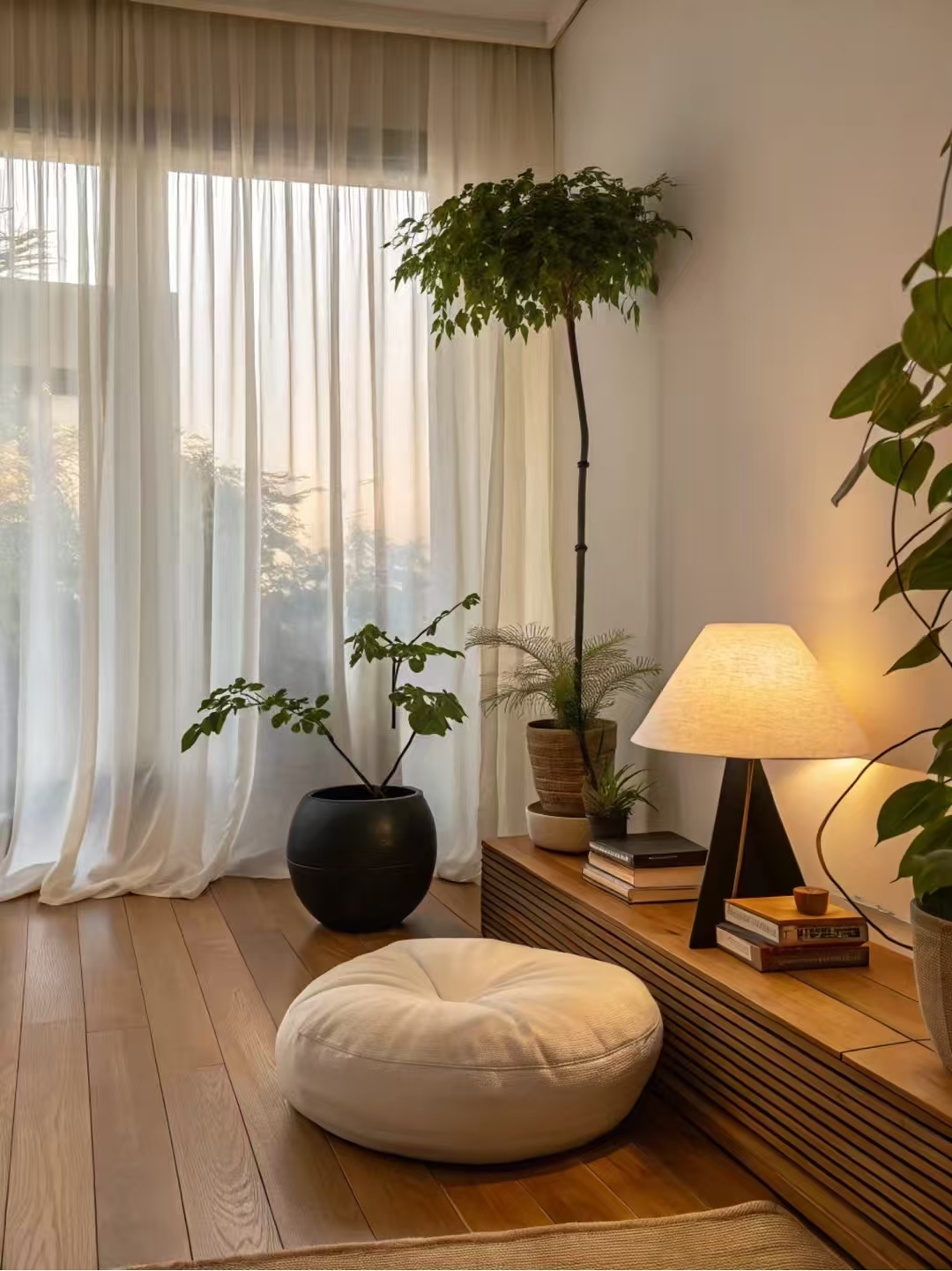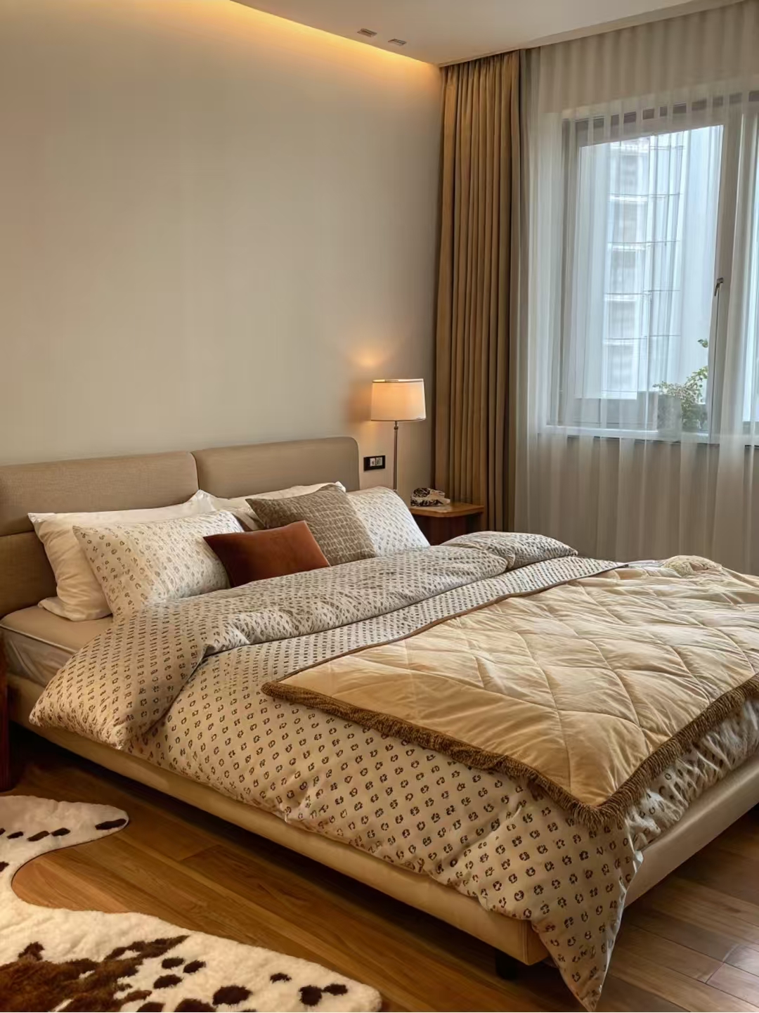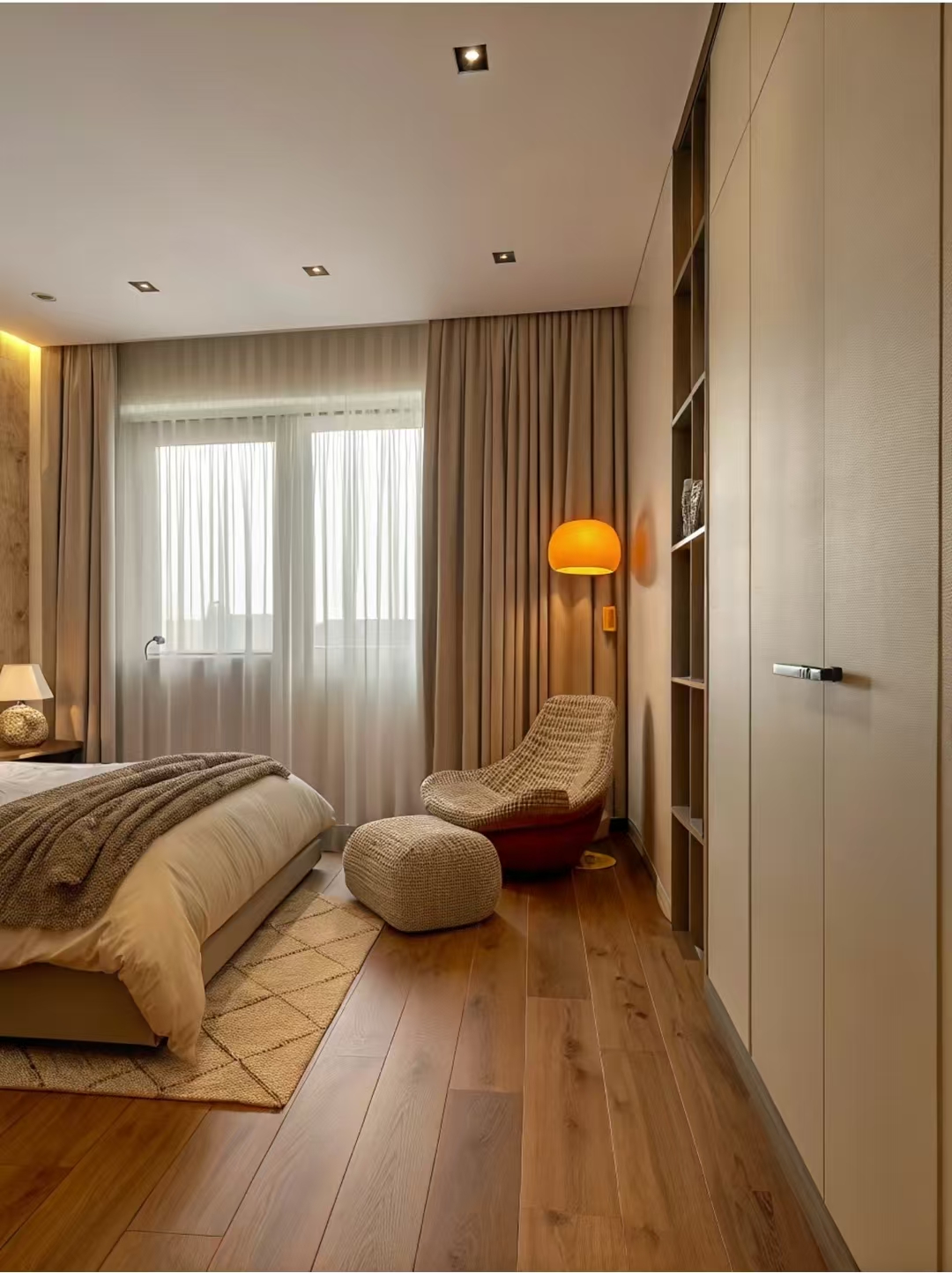 Pehme valgustus ja mugav voodipesu aitavad päeva väsimust kaotada. Akna ääres asuvad õhukesed kardinad lehvitavad õrnalt imelihtne, päikesevalgus voolab läbi lünkade, luues rahuliku ja kauni atmosfääri.